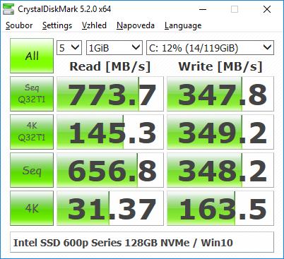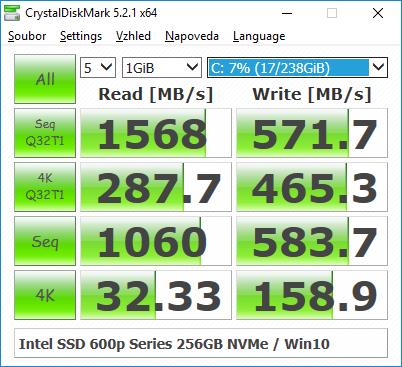 - Intel 600p Series 256 GB: čtení 1570 MB/s, zápis 540 MB/s