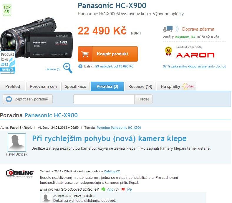 Ano, stabilizátor obrazu kamery HC-V510 dost "klepe", pokud je kamera vypnutá. Následující video ukazuje, co tím myslím. Omlouvám se za horší kvalitu videa, točil jsem to mobilem v jedné ruce a kameru jsem držel v druhé... U obou videí doporučuji sluchátka na uši, je to lépe slyšet a bát se nemusíte, nic tam nevyskočí ;)... Když jsem hledal na internetu něco o tom, zda je klepání normální, narazil jsem na dvě odpovědi prodejců, kteří reagovali na dotaz novopečených majitelů kamer Panasonic, kteří byli evidentně z klepání také překvapeni. Dovoluji si přiložit dva screenshoty těchto diskuzí, přičemž ten druhý mě opravdu pobavil — všimněte si, že se bavíme o kameře za cca 22 tisíc Kč a doporučení prodejce je s "kamerou příliš netřepat, aby byla stabilizace obrazu zachována". Skutečný pokrok 250 let po průmyslové revoluci a 66 let od vynálezu tranzistoru :).