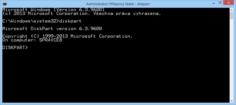 Spustíme si tedy příkazový řádek jako správce a ihned po jeho otevření spustíme utilitu DISKPART.