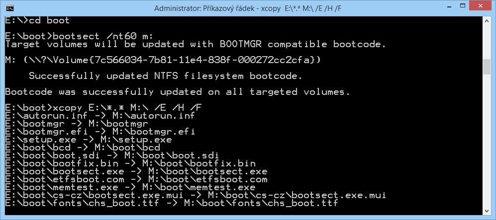 E: cd boot\ bootsect /nt60 M: xcopy E:\*.* M:\ /E /H /F