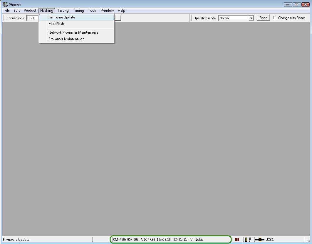 e52_flash_1.jpg Ve spodní části okna by se měl detekovat přípojený přístroj jako RM-469. Je zde vidět i aktuální verze firmware v telefonu plus další informace. V dalším kroku zvolíme v menu Flashing -> Firmware update.