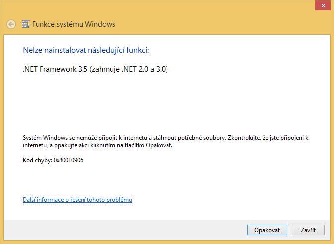 Systém Windows se nemůže připojit k internetu a stáhnout potřebné soubory. Zkontrolujte, že jste připojeni k internetu, a opakujte akci kliknutím na tlačítko Opakovat. Kód chyby: 0x800F0906