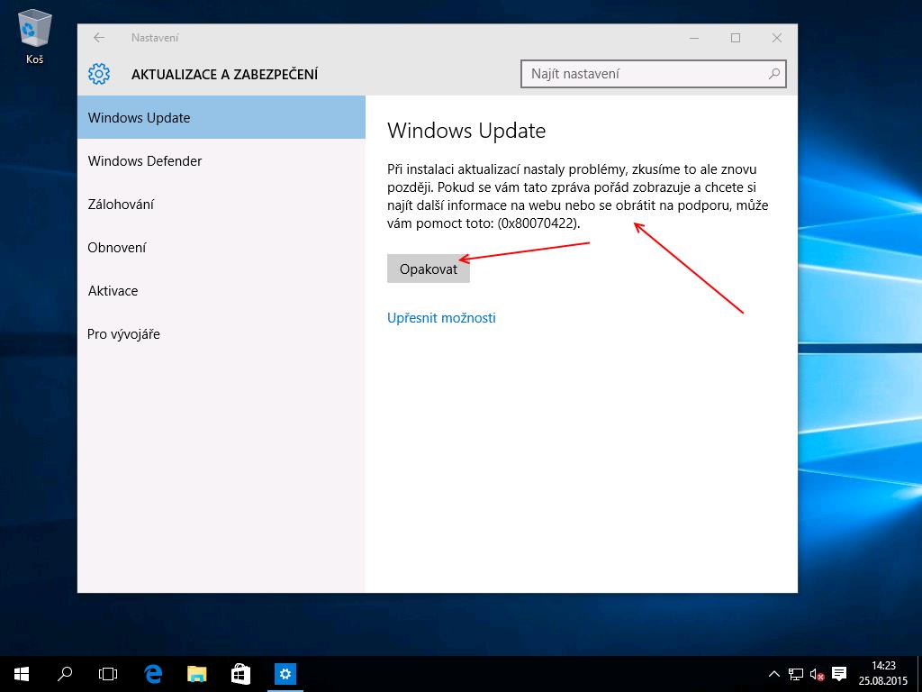 Hledání aktualizací by mělo skončit s chybou, jak je ukázáno na obrázku, protože služba automatických aktualizací je zakázána.