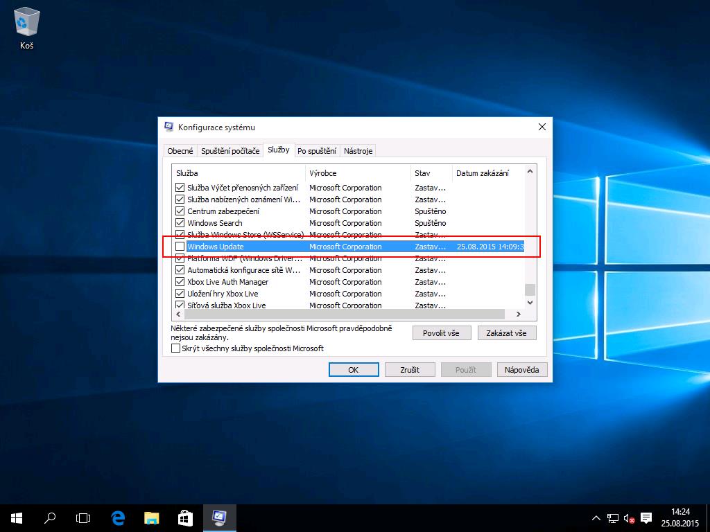 Nástroj využívá jednoduchý dialog, ve kterém je seznam všech služeb. Nalistujeme v něm službu Windows Update a zakážeme ji jednoduše zrušením zaškrtnutí pole vedle názvu.