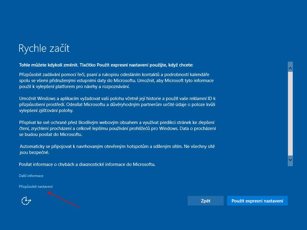 Instalace Windows 10 je celkem jednoduchá a v podstatě téměř bezobslužná. Téměř před dokončením instalace či upgrade systému jsme ale dotázání dialogem "Rychle začít" k použití "Expresního nastavení". Toto expresní nastavení nám ušetří pár vteřin času, ale ve výchozím nastavení povolí systému odesílat mraky diagnostických dat směrem k Microsoftu. To jistě nechceme...