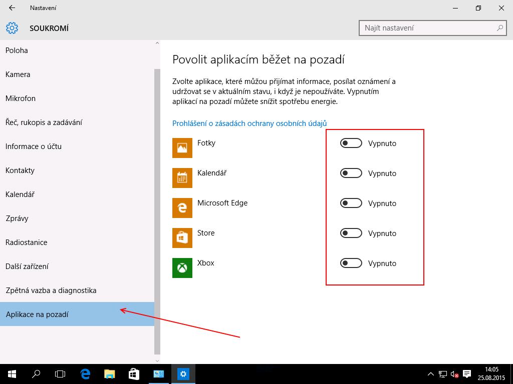 Doporučuji také vypnout možnost běžet aplikacím na pozadí a tím pádem i zakázat těmto aplikacím přijímat a odesílat informace a oznámení.
