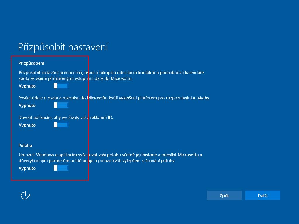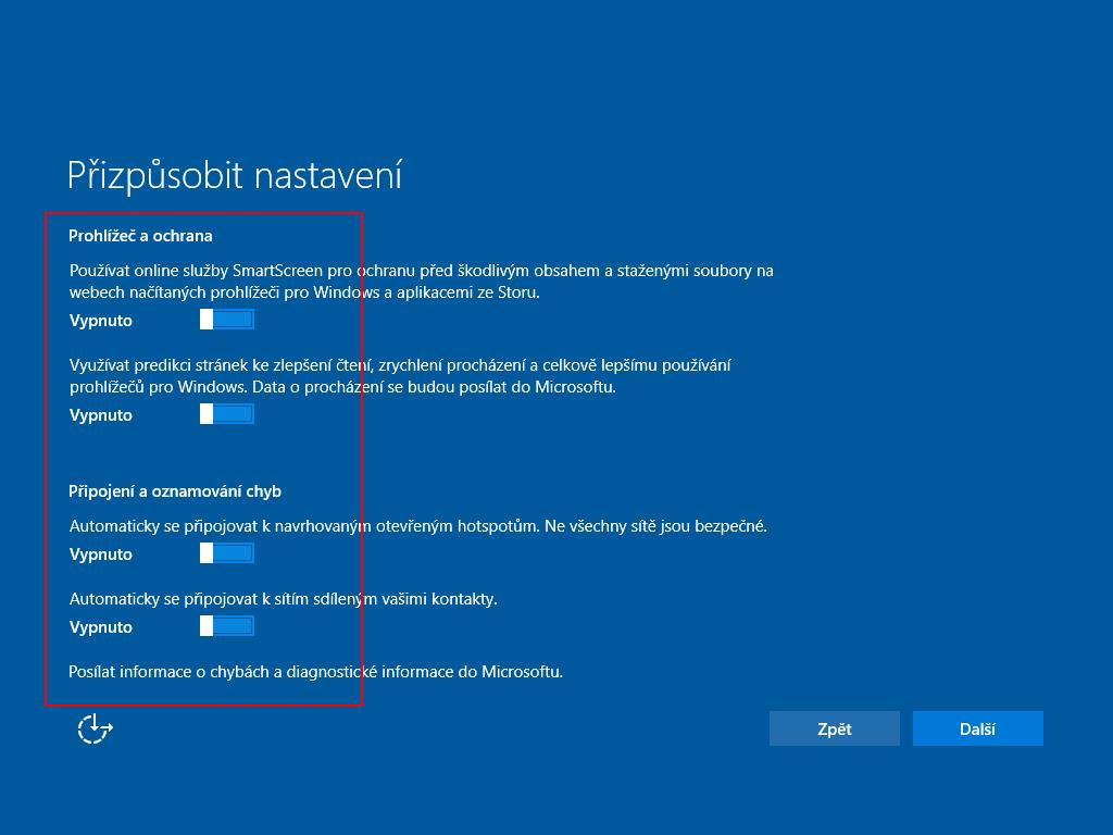 Je proto vhodné zvolit možnost "Přizpůsobit nastavení" a postupně na dvou dalších obrazovkách vypnout všechny nabízené volby, jmenovitě tyto (není třeba nad ničím přemýšlet, prostě vypnout úplně všechno):