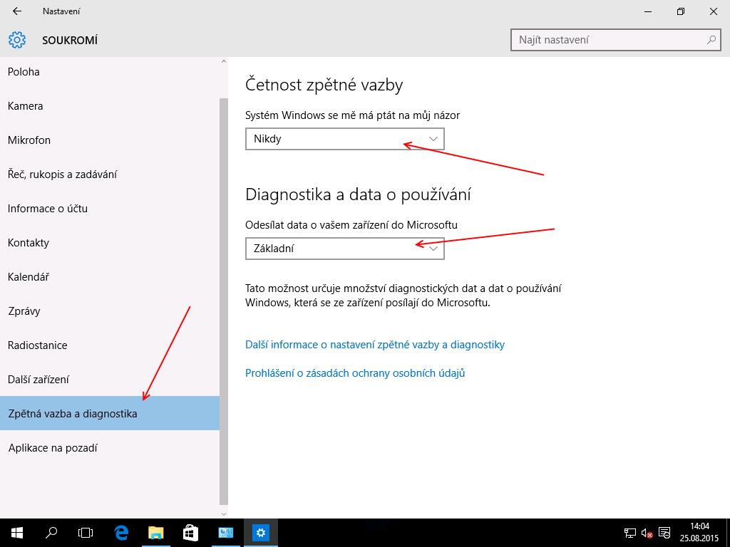 I pokud provedeme výše uvedené změny v nastavení soukromí, stále bude systém odesílat statistické a diagnostické informace směrem k Microsoftu.Pozor: Před tím, než budeme pokračovat dál, je ale vhodné zamyslet se nad tím, zda se jedná o něco, co by nám mohlo skutečně vadit. Systém totiž neodesílá žádná velká kvanta informací a jedná se opravdu pouze o statistické a diagnostické informace. O podrobnostech se můžeme dočíst například zde na root.cz: Windows 10: analýza probíhající komunikace.